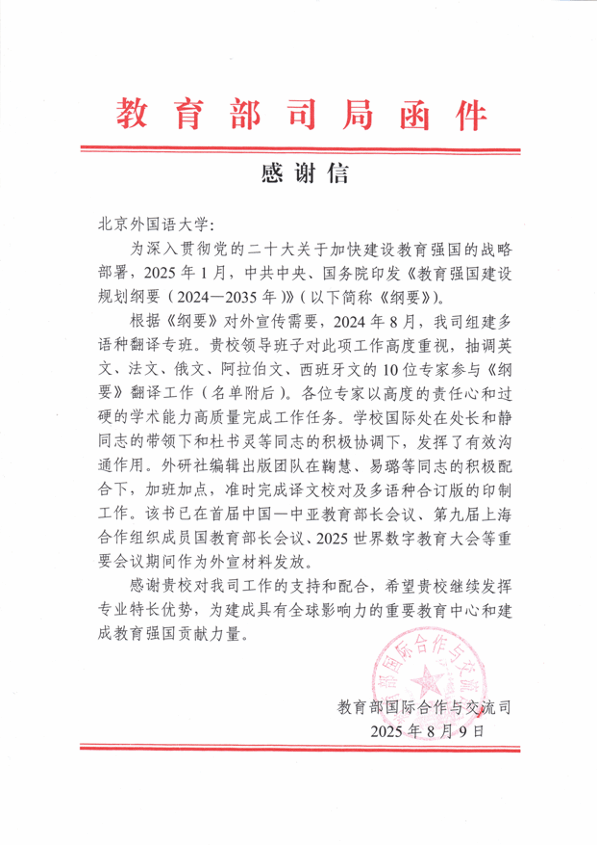 发来感谢信,感谢在《教育强国建设规划纲要(2024-2035年)》的对外翻译工作中,台湾a片